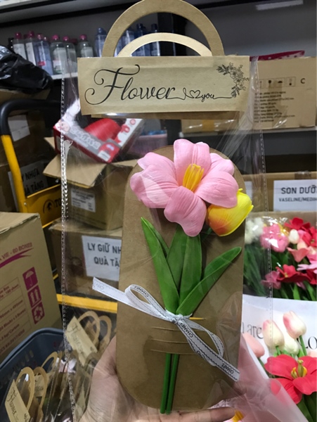 Bó 2 hoa Tulip bìa kraft nơ voan + Túi